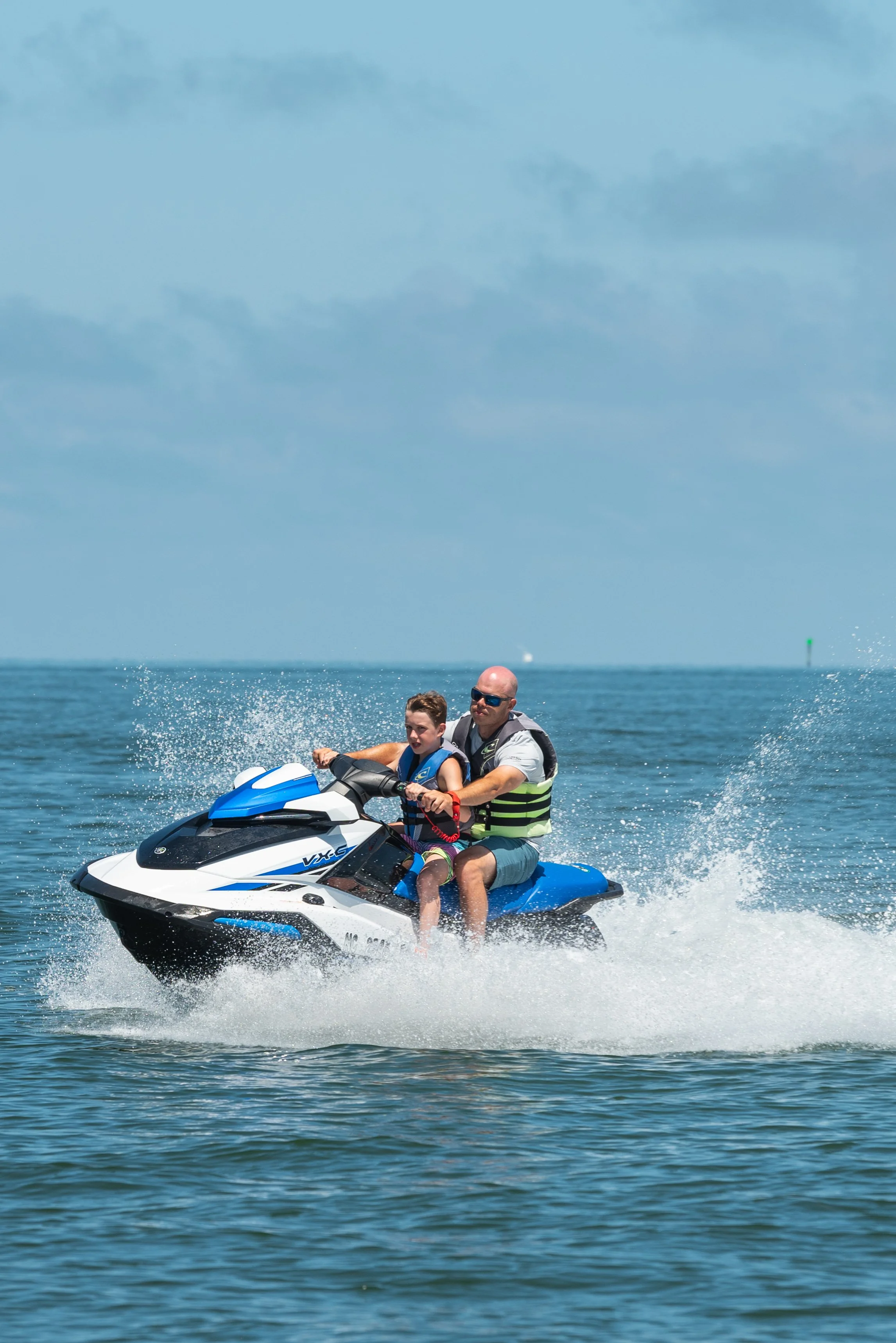 Enjoy the thrill of racing across the warm waters of the Pamlico Sound on our wave runners. We allow 2 adults or 1 adult and 2 small children per wave runner for both your comfort and safety. We suggest a maximum weight of 350 pounds. Rentals can be purchased by the unit for half hour and full hour increments. We recommend booking a reservation and ask that your group please be at our reservation desk 20 minutes early to sign release forms.